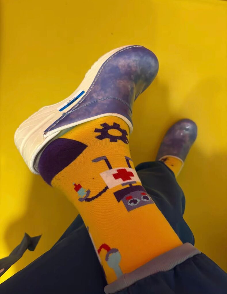 Vrolijke sokken vallen namelijk op! Ik als ambassadeur van Medsocks en als anesthesiemedewerker ben trots dat ik ze met plezier mag dragen.